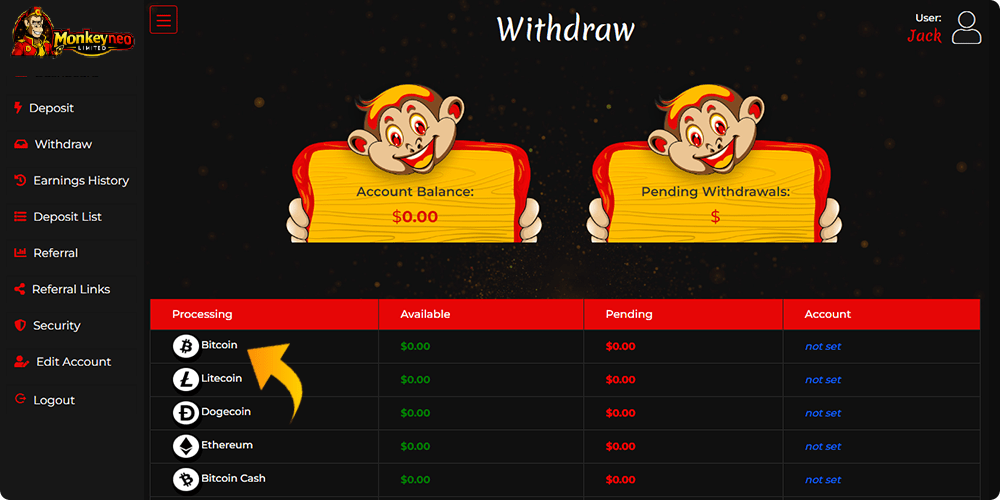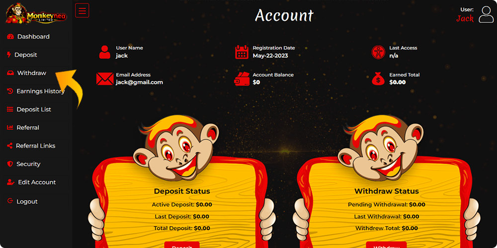 Click withdraw on any page of your personal account.