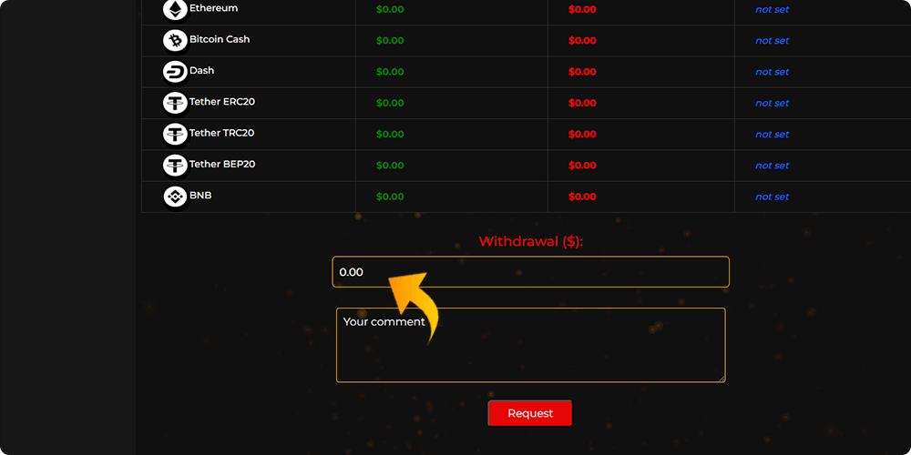 Choose a payment system with a sufficient amount of funds, enter the amount, and click REQUEST.